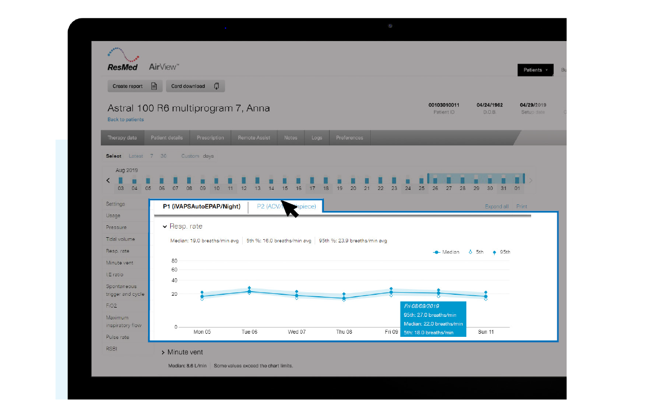 Με τις διασυνδεδεμένες συσκευές BiPAP της ResMed, Aircurve & Lumis, καθώς και τους Αναπνευστήρες Astral & Stellar και ενεργοποιώντας την προαιρετική υπηρεσία Airview για Αναπνευστήρες, ο γιατρός σας, αποκτά εξ' αποστάσεως πρόσβαση σε πραγματικό χρόνο στις ρυθμίσεις και τα κλινικά δεδομένα, αυξάνοντας κατακόρυφα την ποιότητα των υπηρεσιών στον κατ' οίκον μηχανικό αερισμό σε